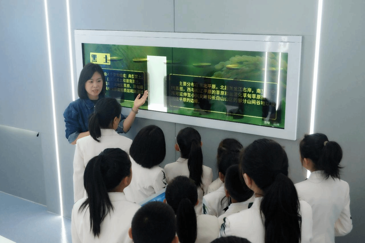 走进大数据中心展厅,展厅内的滑轨屏吸引了孩子们的目光,虚拟讲解员向孩子们介绍了农业从1.0到4.0的发展史,从最初依赖人力畜力的传统农耕,到如今智能化、信息化的现代农业,孩子们直观地感受到农业发展的巨大跨越。关于黑龙江大农业发展现状和省农科院“当家品种”的介绍,让孩子们更深刻了解到家乡作为全国粮食生产第一大省的重要地位,以及背后农业科技的强大支撑。“无人农场”和“智能温室”短片展示了无人驾驶的农机在农田上方精准作业,智能温室里各类传感器实时监测并调控环境参数的场景,引发学生们阵阵惊叹。