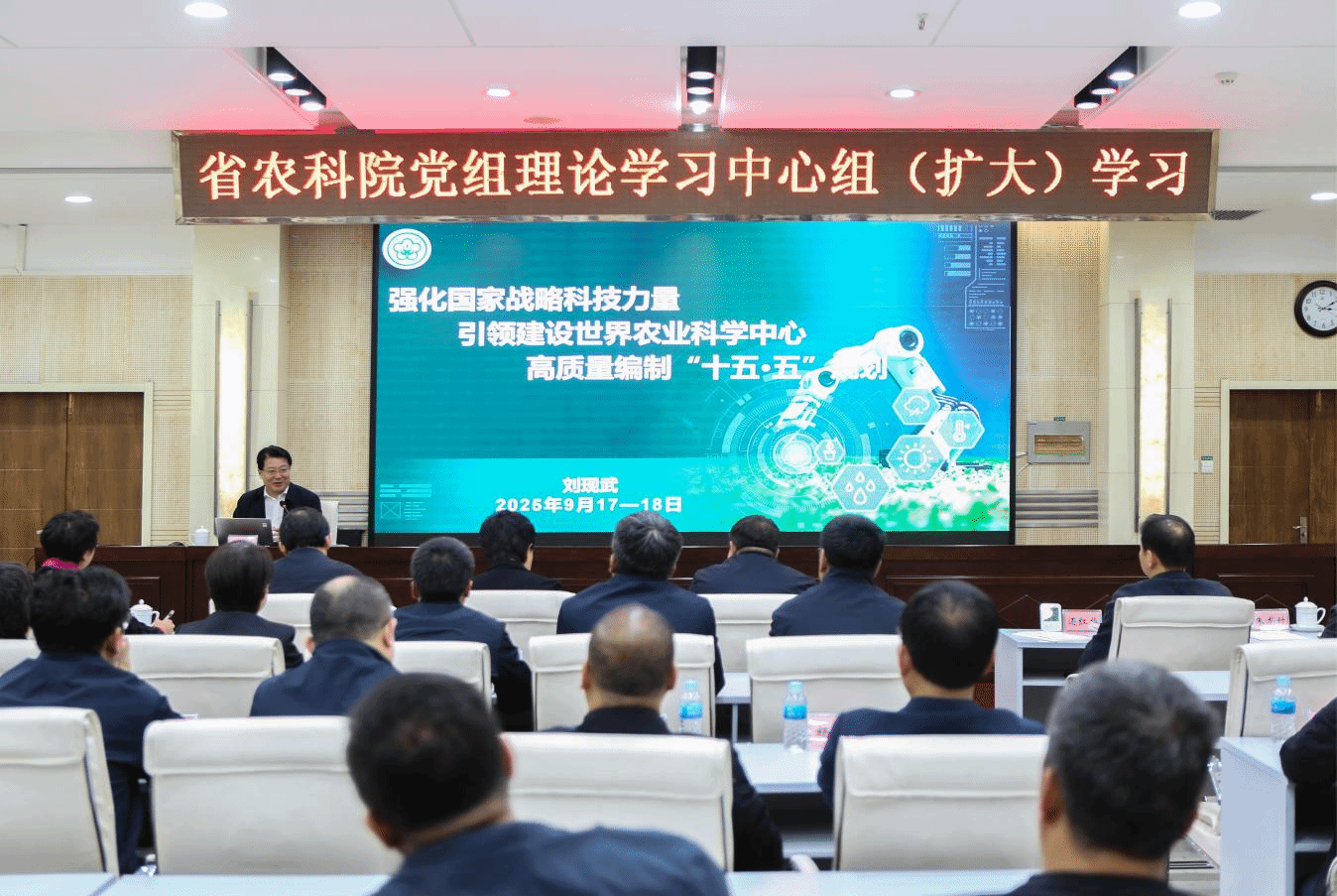 10月10日下午,黑龙江省农业科学院召开党组理论学习中心组(扩大)学习,邀请中国农业科学院党组成员、副院长刘现武就“十五五”规划编制作专题辅导。省农科院党组书记、院长陈宇辉主持会议。