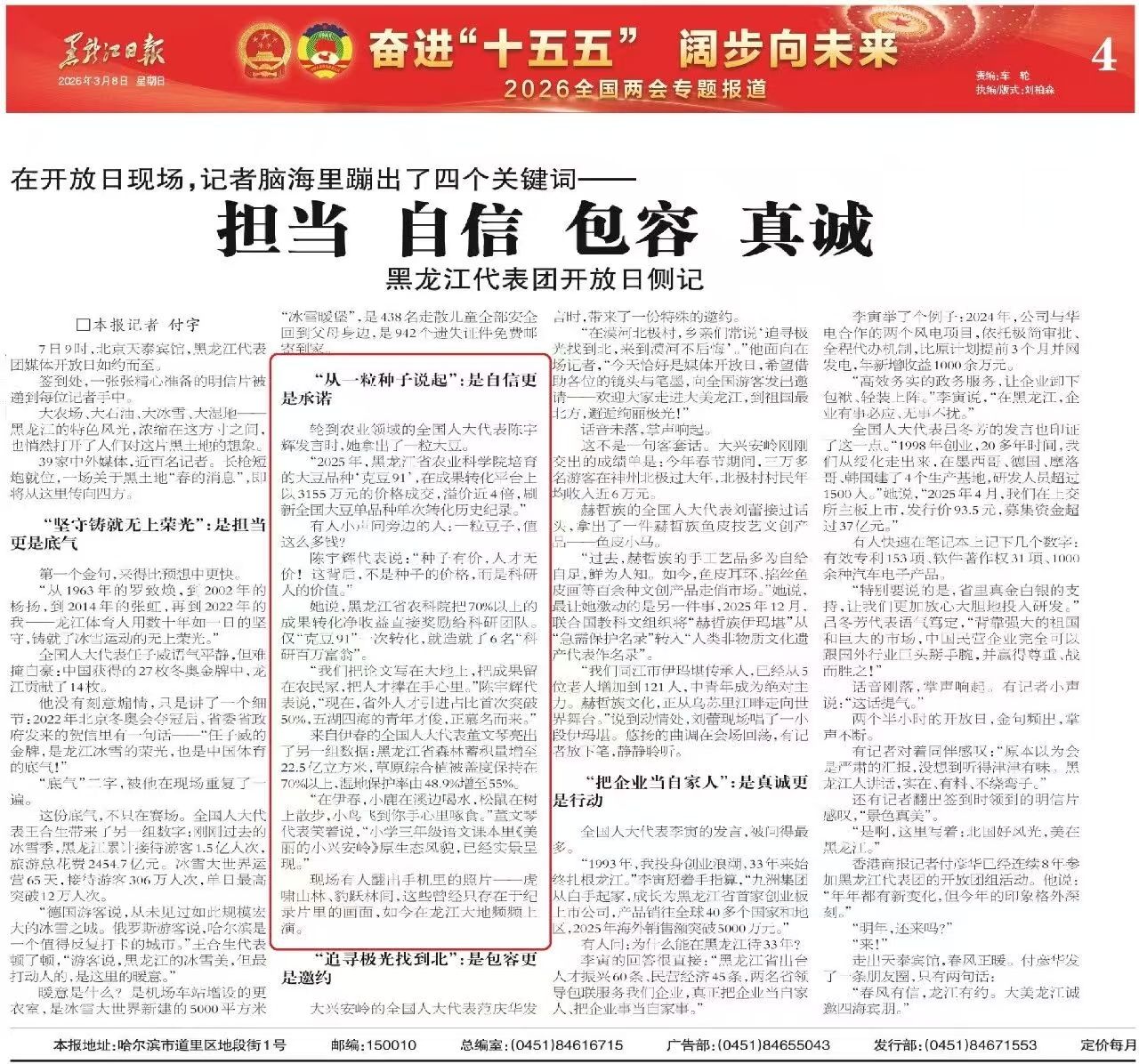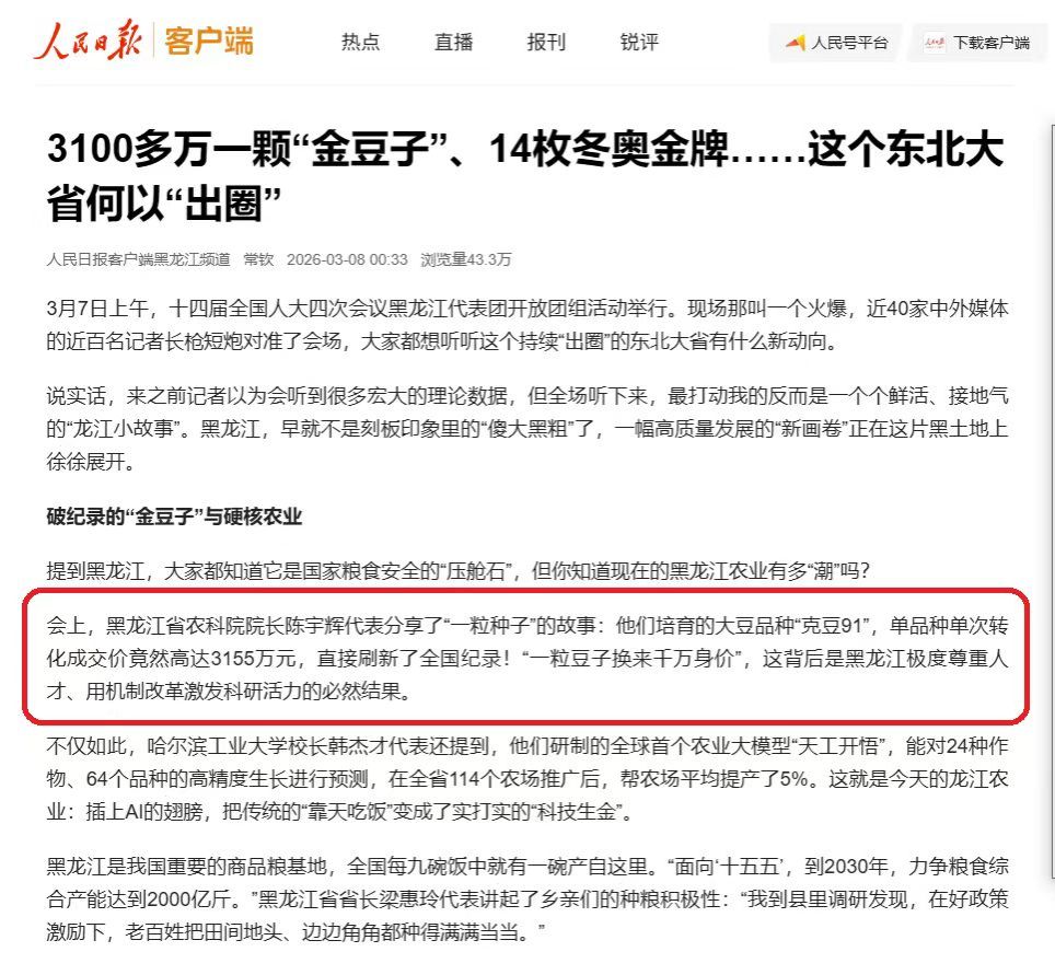 轮到农业领域的全国人大代表陈宇辉发言时,她拿出了一粒大豆。“2025年,黑龙江省农业科学院培育的大豆品种'克豆91’,在成果转化平台上以3155万元的价格成交,溢价近4倍,刷新全国大豆单品种单次转化历史纪录。”有人小声问旁边的人:一粒豆子,值这么多钱?