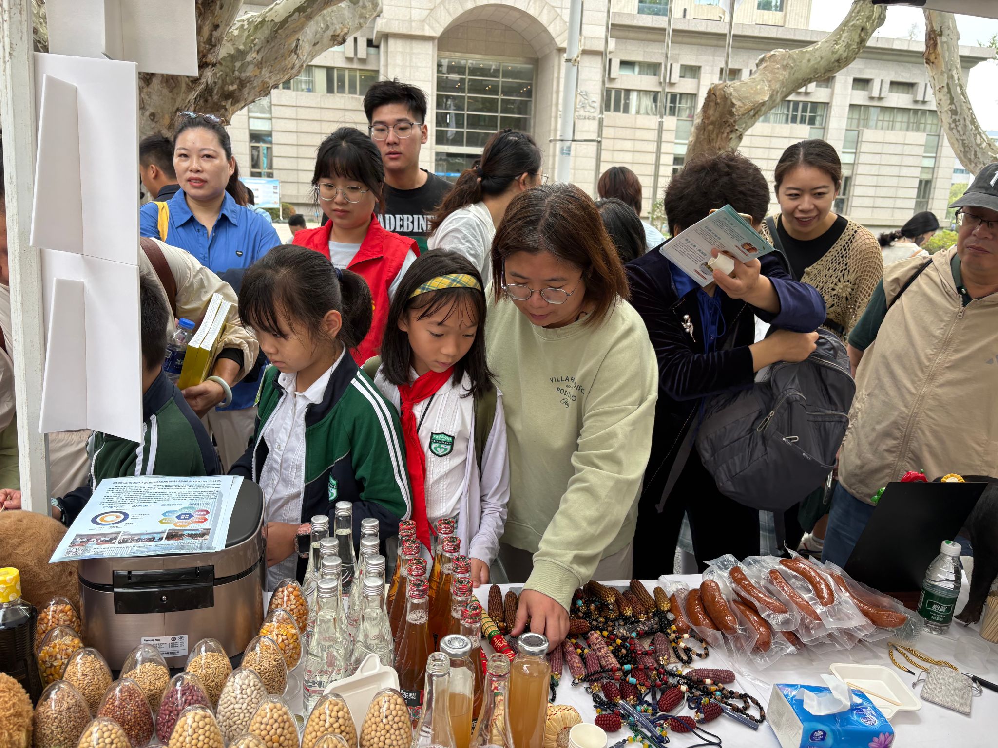 在我院产品展销区前人头攒动。来自黑龙江的特色农产品龙民黑猪红肠、黑木耳、冻梨汁、桦树汁、文玩玉米、高粱锤子凭借其独特风味与优良品质广受南京市民追捧。我院展品在短时间内销售一空,充分展现了江苏消费者对黑龙江优质农产品的认可与喜爱。